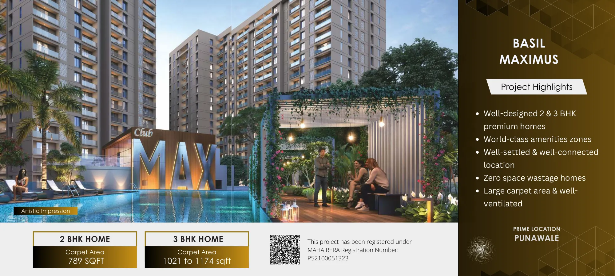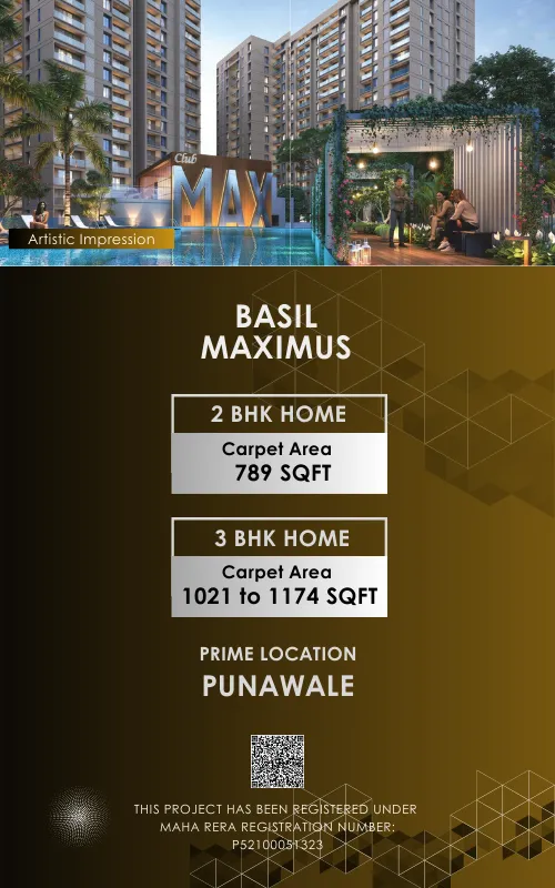 Escape into luxury and indulge in sophisticated contemporary living at Basil Maximus. This prestigious development redefines extravagance with its prime 3 & 2 BHK residences. Meticulously designed, the spacious residences feature awe-inspiring views and unmatched amenities like serene gardens and a refreshing pool, inviting you to embrace the height of modern living. Conveniently located in Punawale, Basil Maximus transcends expectations with its symbolic grandeur and exceptionally abundant lifestyle.